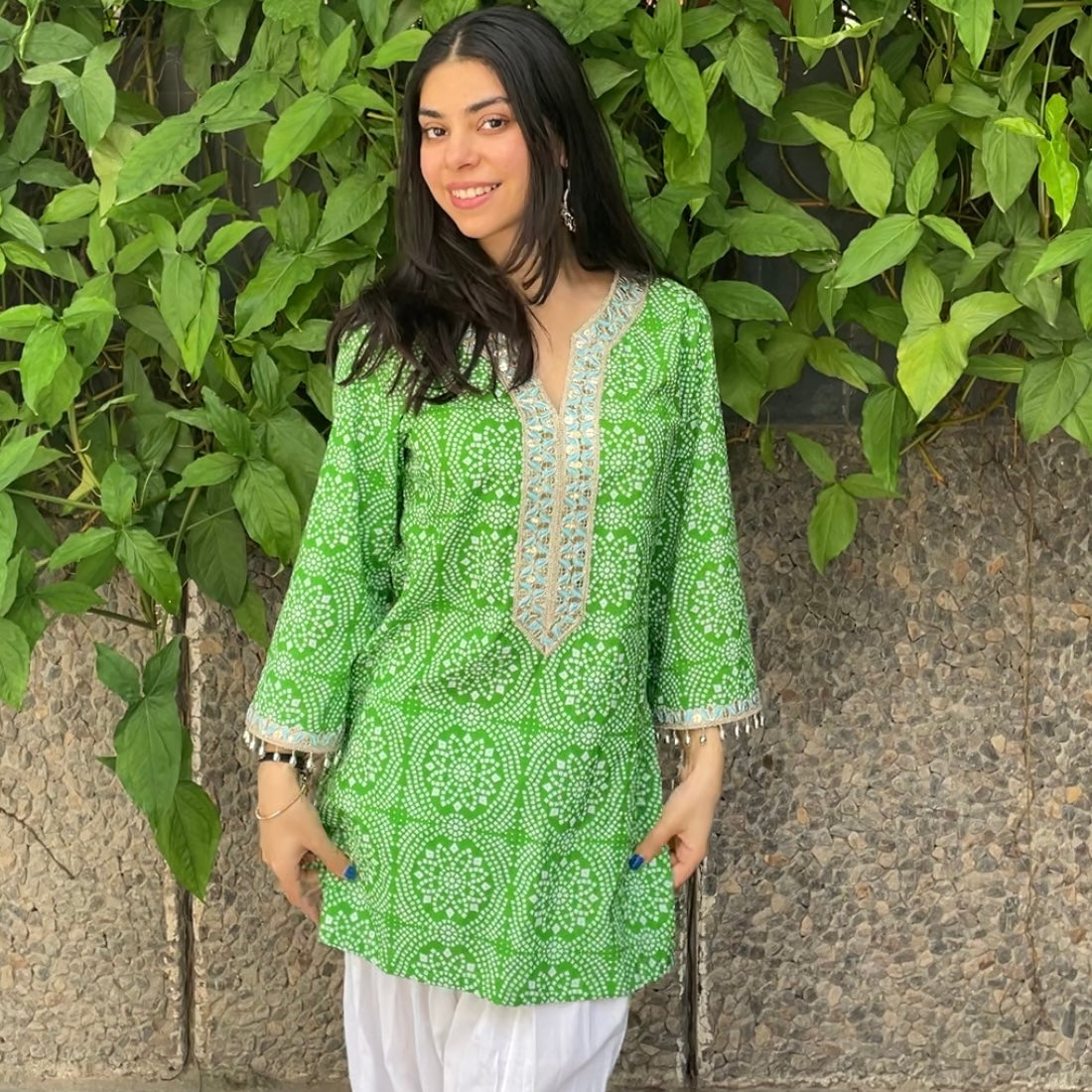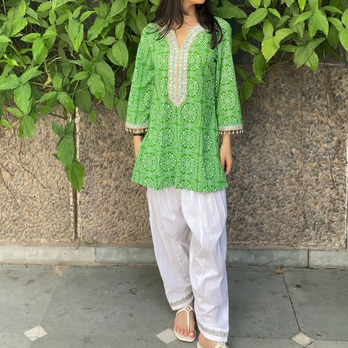 - Festive cotton kurtis with detailing on neck, sleeves and salwar pants