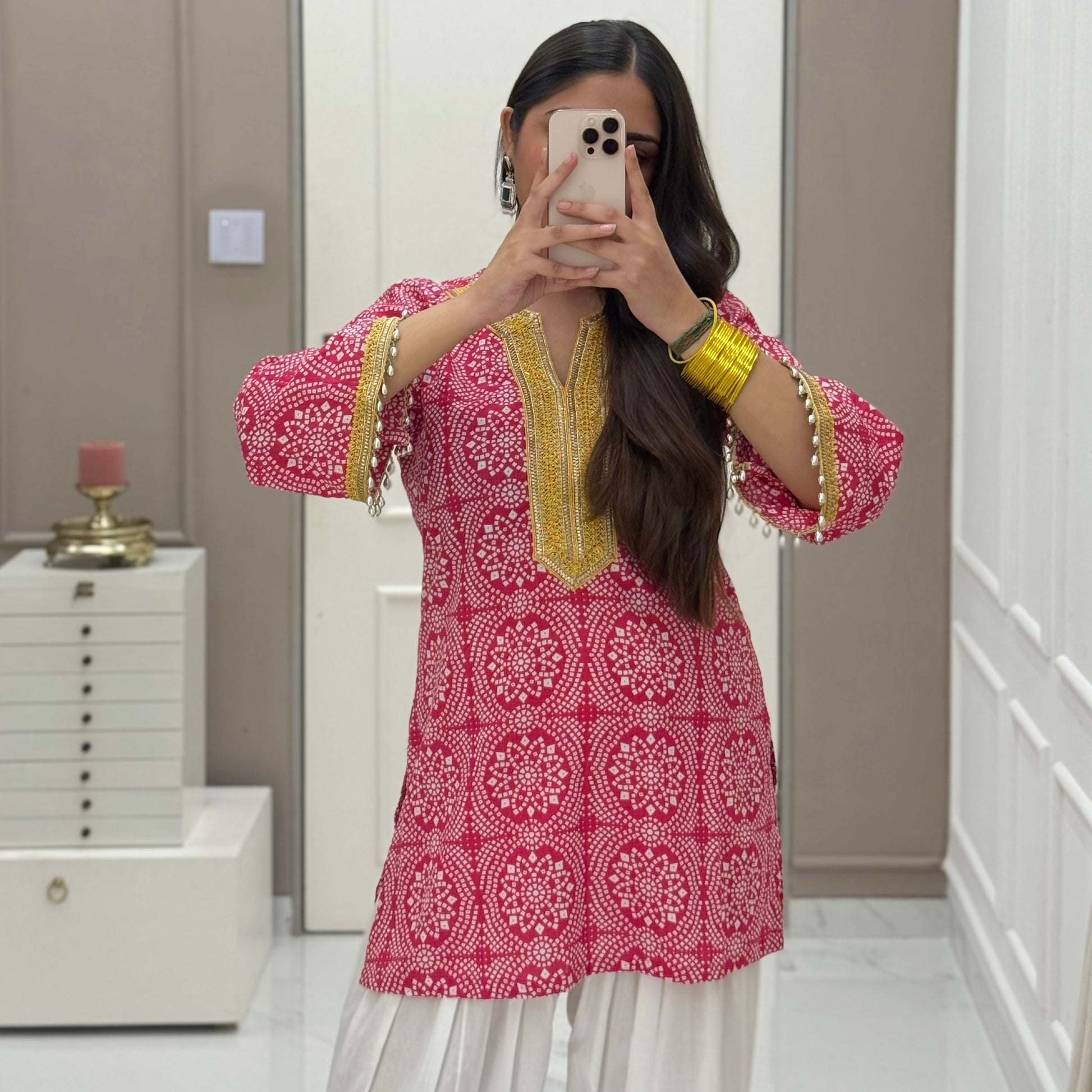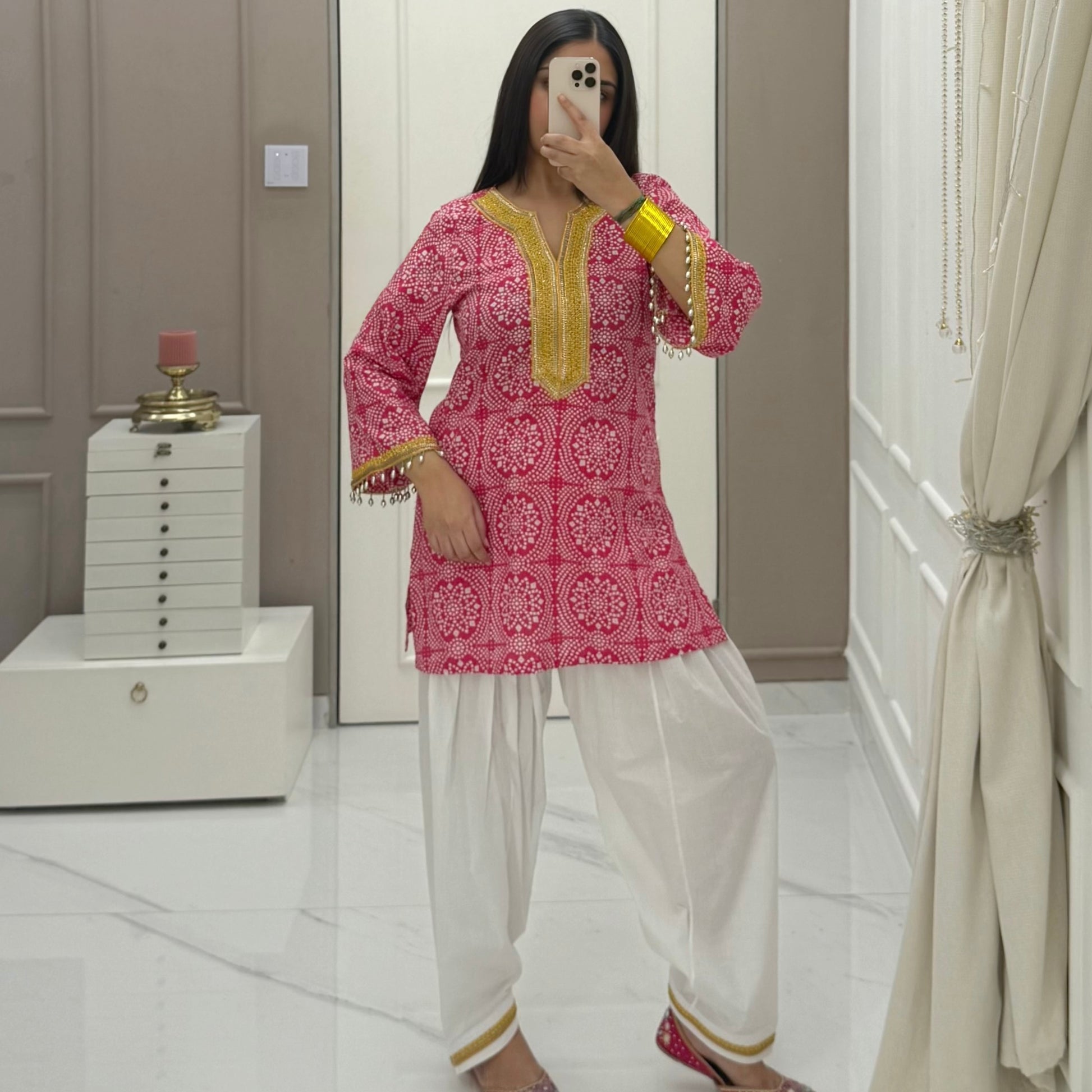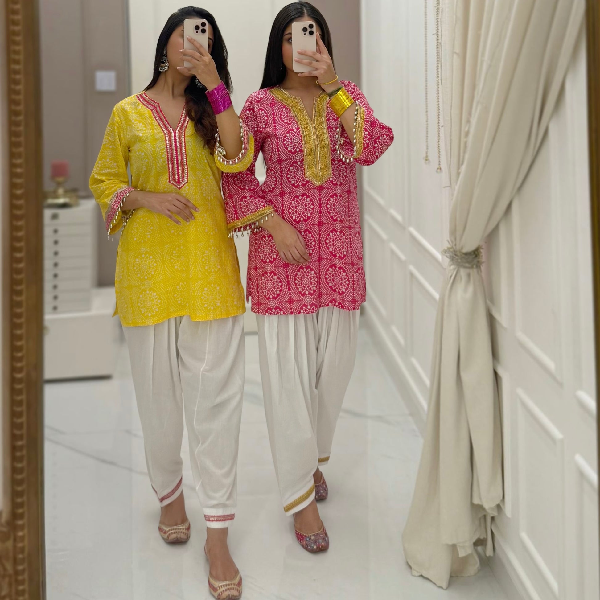 - Festive cotton kurtis with detailing on neck, sleeves and salwar pants